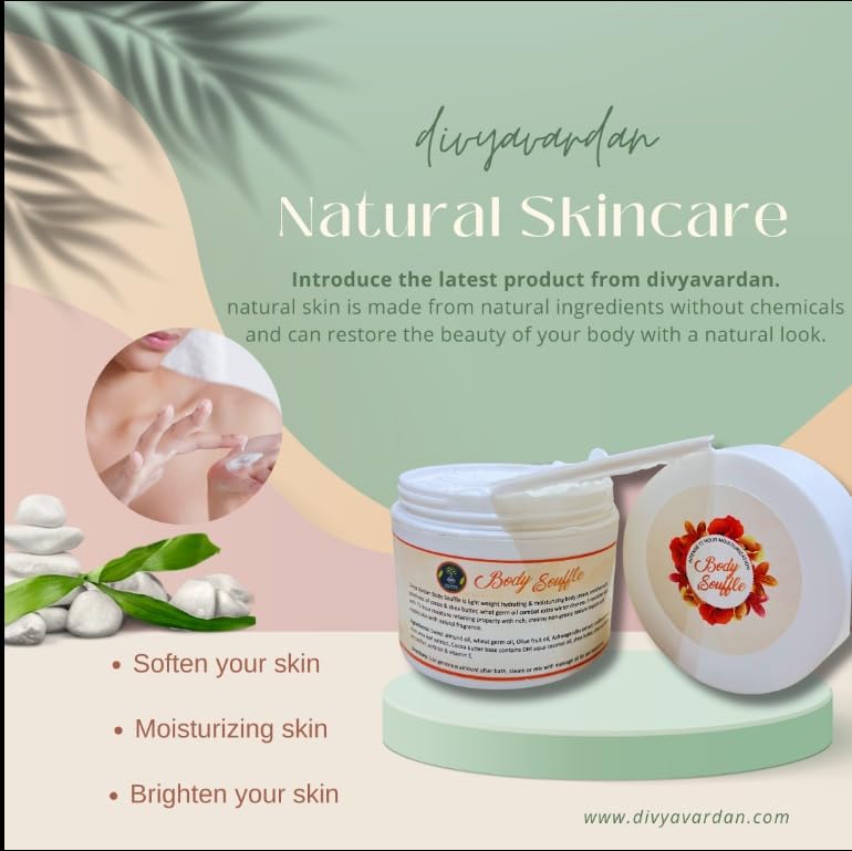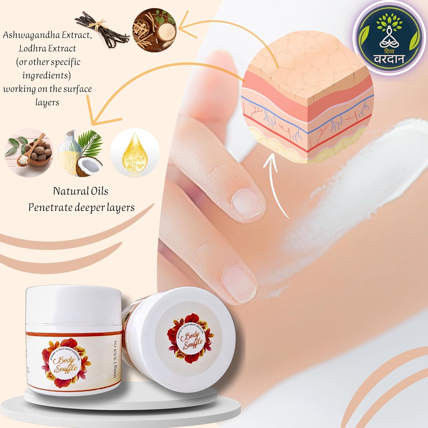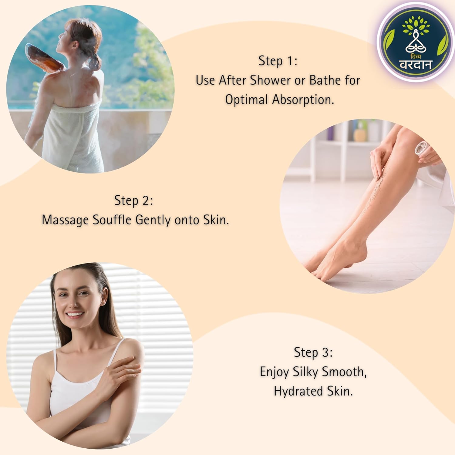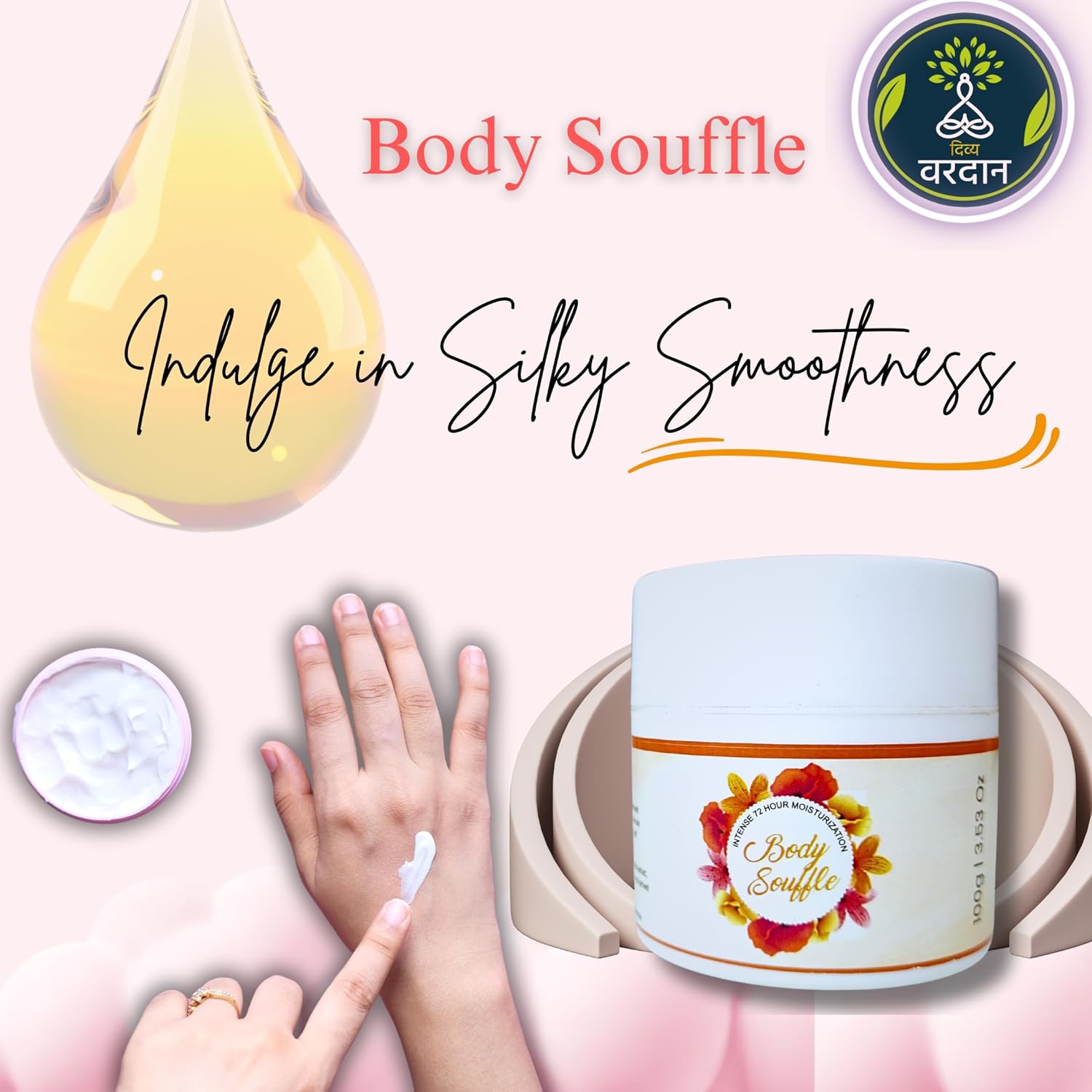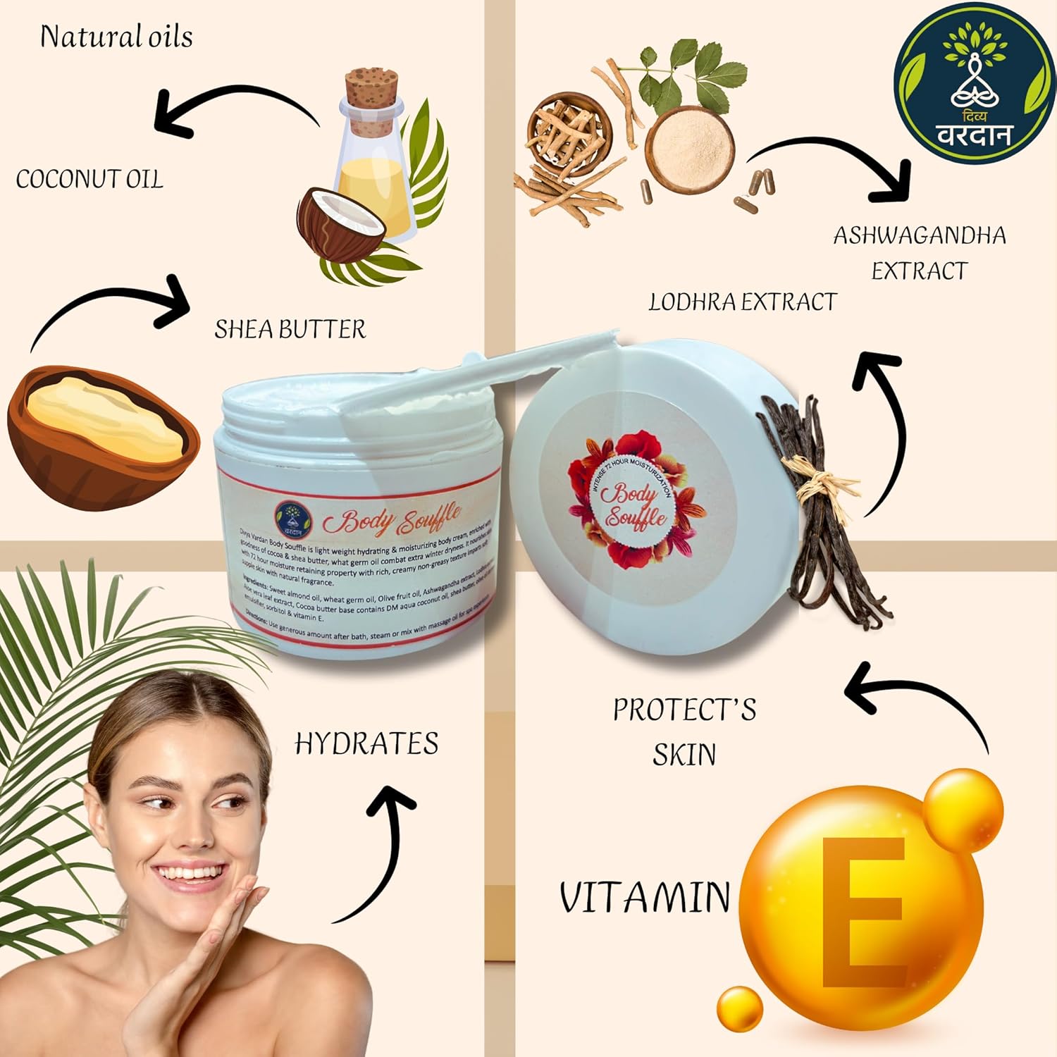 Divyavardan’s Body Souffle is used for nourishing skin with 72 hour moisture retaining property with rich, creamy non-hreasy texture imparts soft supple skin with natural fragrance.